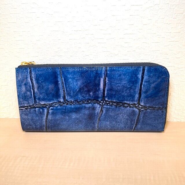 牛革にエナメルラメ加工を施し、クロコの型押しを行っています。 色合いのムラを出すことで、アンティーク感を表現しています。